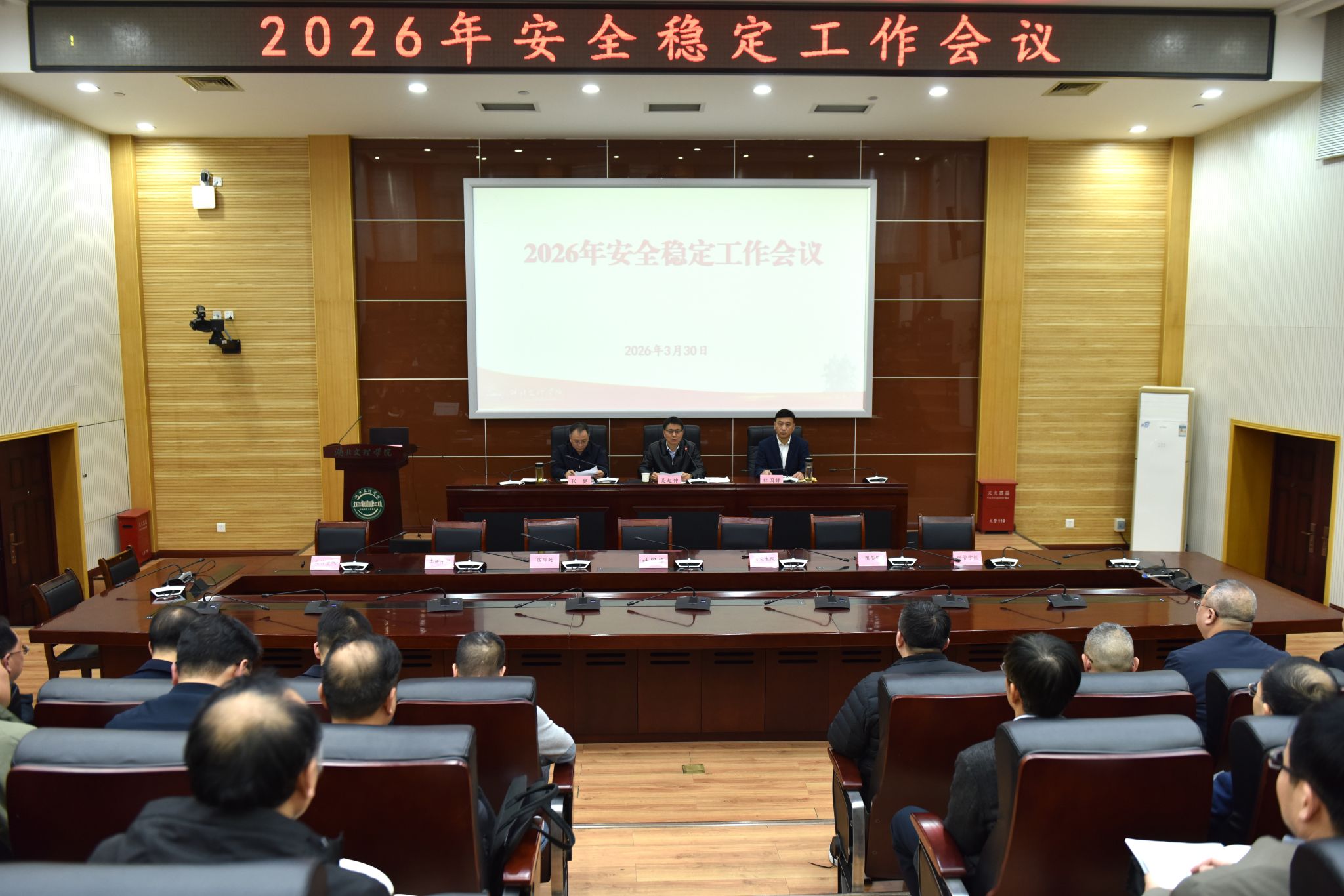 (保卫处 通讯员 唐甜甜)3月30日,学校召开2026年安全稳定工作会议暨平安建设目标管理责任书签订仪式。党委书记吴超仲,党委副书记、校长杜国锋出席会议,党委副书记、副校长张樊主持会议。
